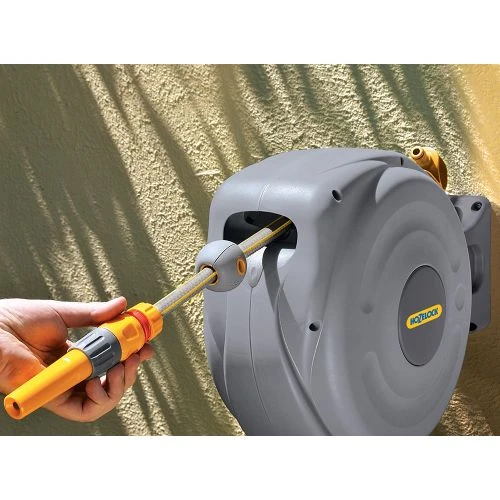 Le dévidoir automatique AUTO REEL de Hozelock facilite l’enroulement et le déroulement du tuyau. Un montage mural avec mécanisme de pivotement à 180 ° facilite l’arrosage des différentes zones du jardin. Un ressort puissant rétracte automatiquement le tuyau, sans vrillage, sans nœuds et sans effort.