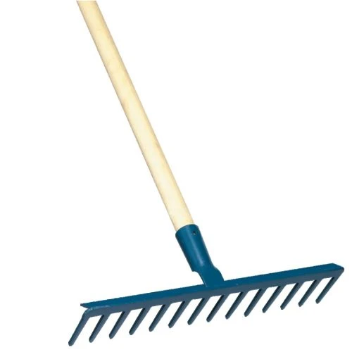 Le râteau forgé à 14 dents droites est un outil en métal acier à douille avec un manche en bois, pour un râtelage facile et efficace.